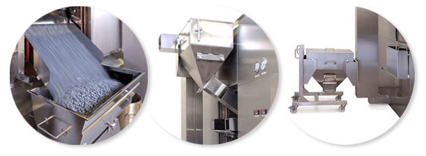 - Unloading on the sterile side, even into containers for direct transport to the sealing machine, or with RABS technology